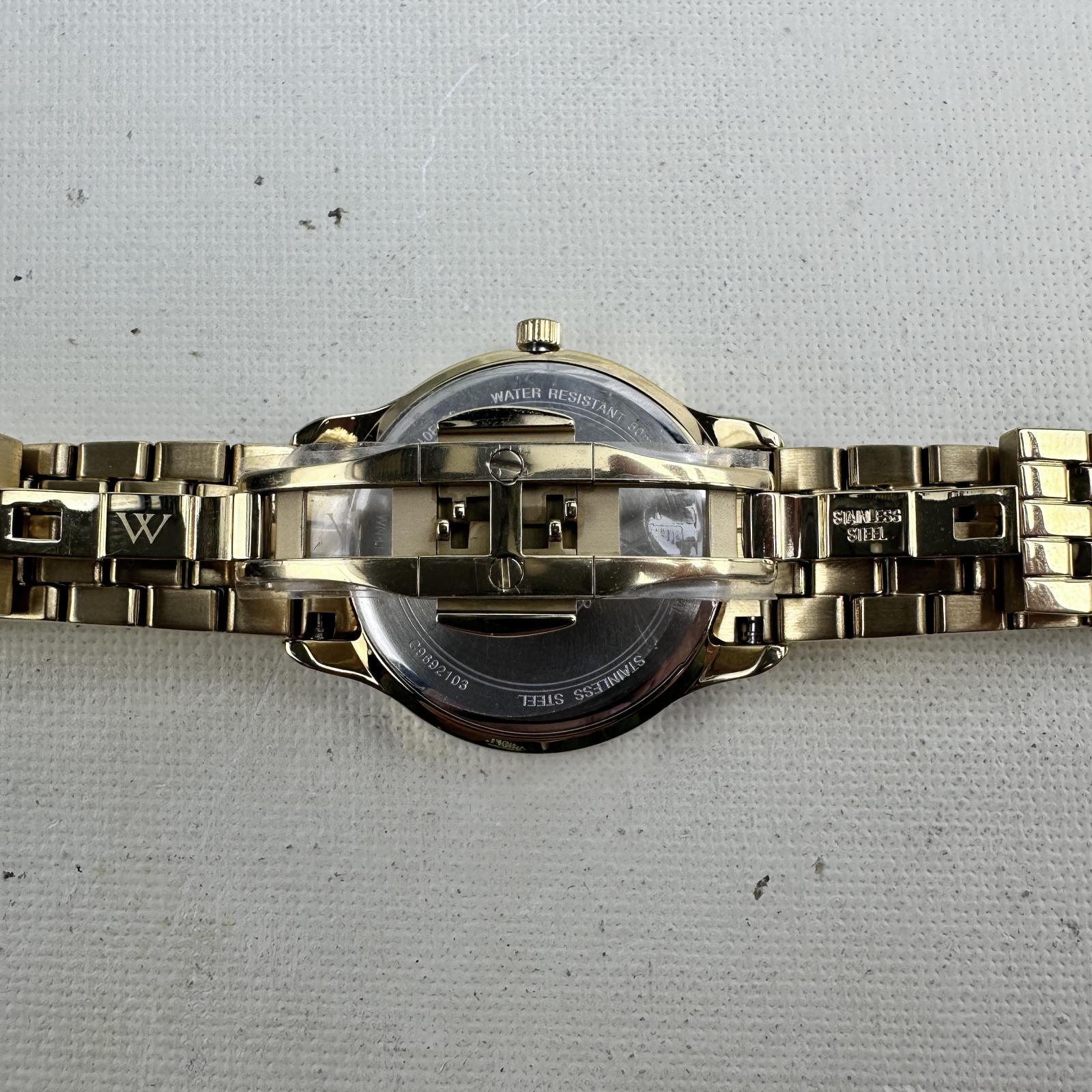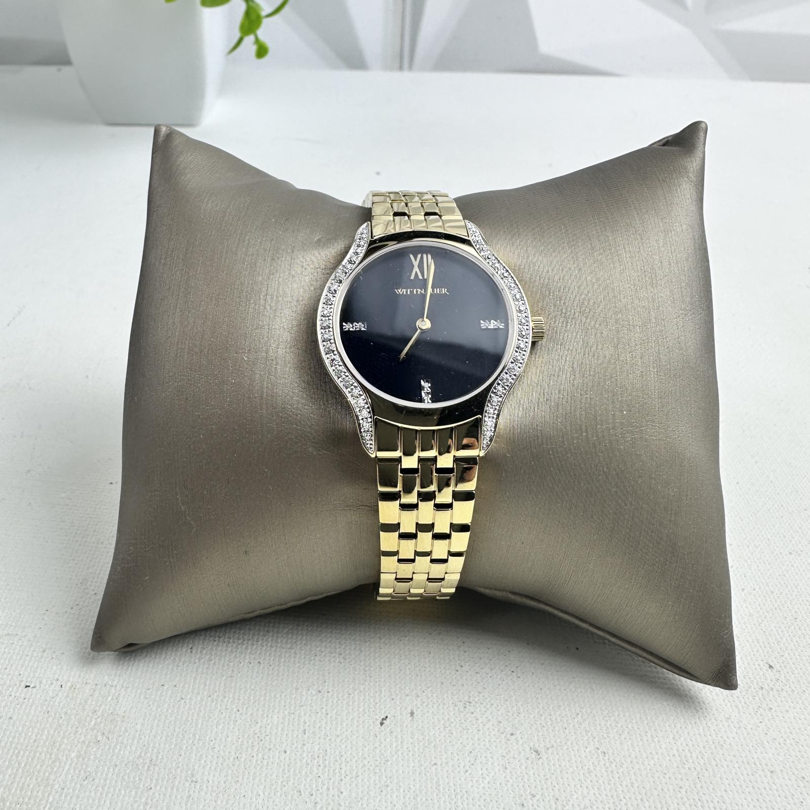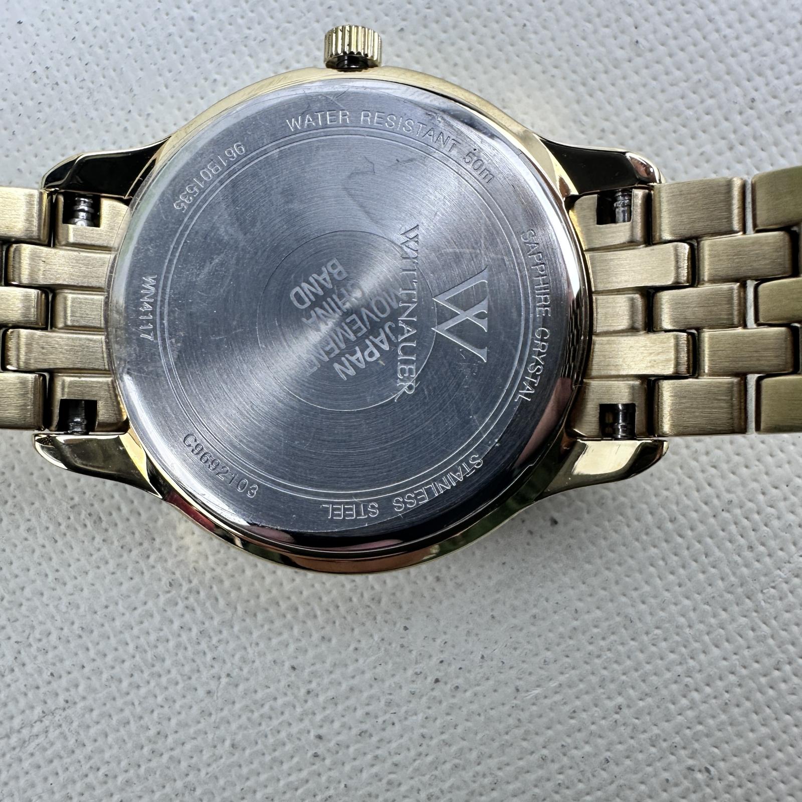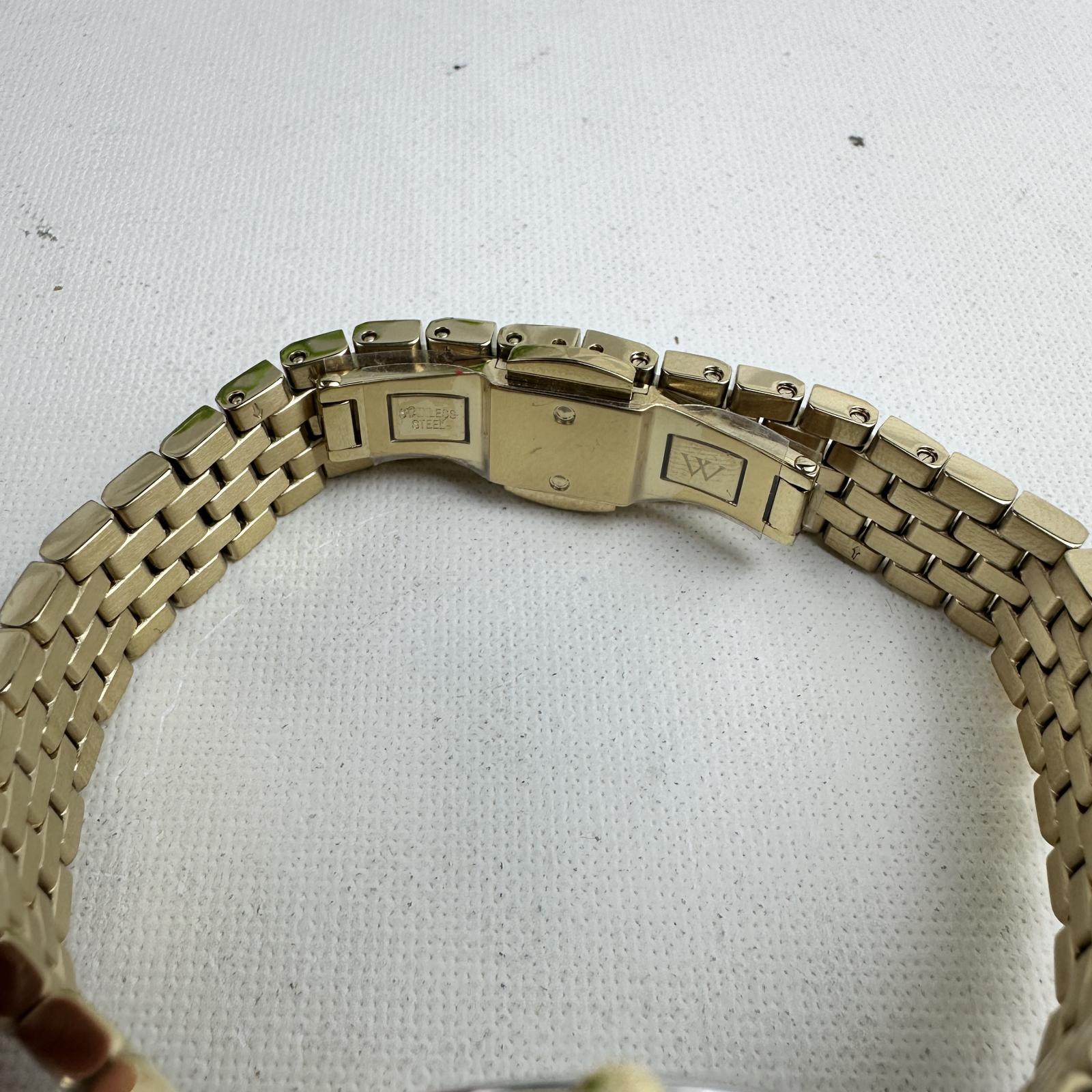 with minor signs of wear. Refined and radiant, the Wittnauer WN4117 women’s watch features a 32mm stainless steel case and bracelet, highlighted by elegant diamond accents on the dial.