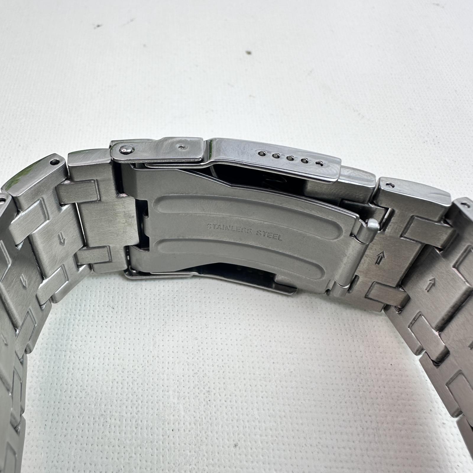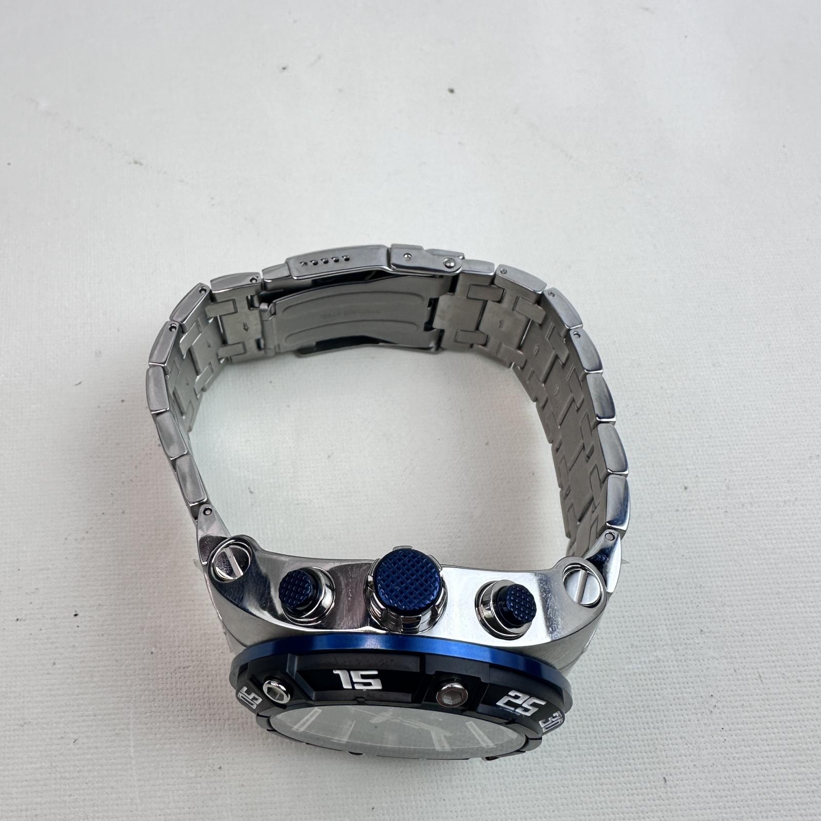 Featuring a 50mm stainless steel case and band, this watch exudes rugged sophistication. The blue metal dial includes luminous hands and hour markers for clear visibility, complemented by chronograph subdials that deliver accurate timing performance.