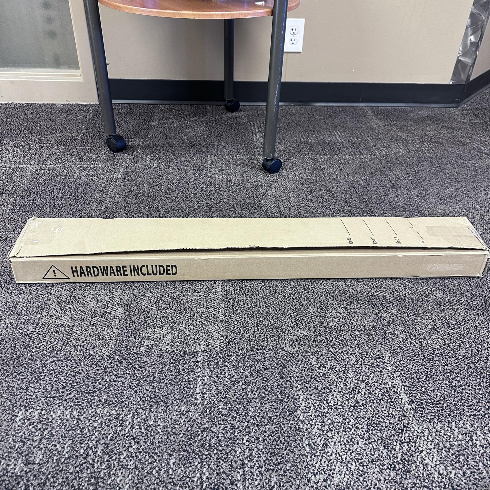 This cordless faux wood blind measures 39x66 inches and is designed for room darkening. It is in new open box condition, ready for installation.