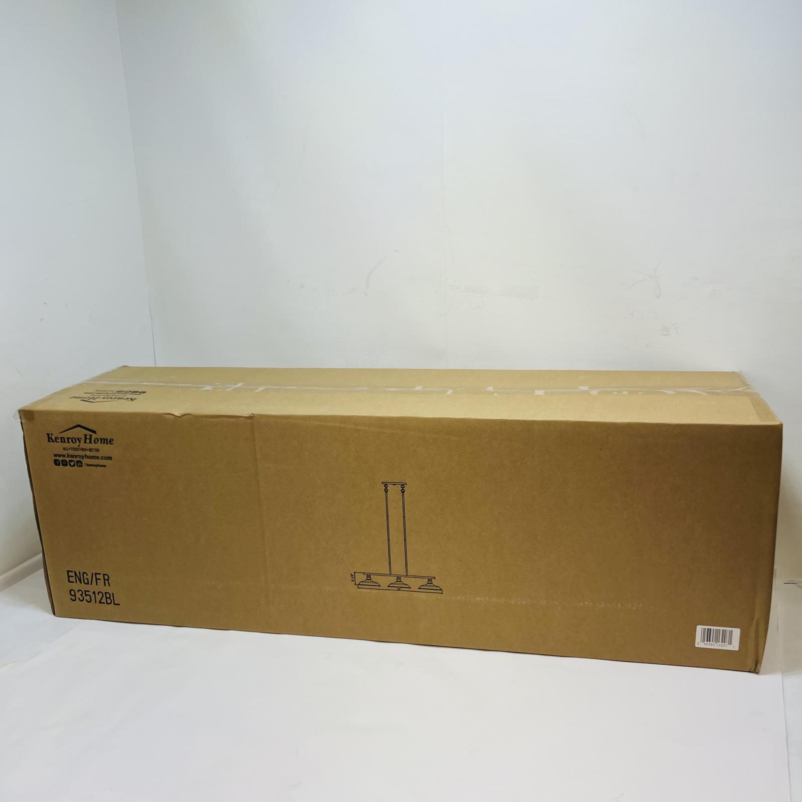 condition This Kenroy Home 93512BL linear pendant light features a clean, modern design ideal for kitchens, dining areas, and kitchen islands. The fixture includes three evenly spaced light heads suspended from adjustable rods, providing balanced illumination across countertops or tables.