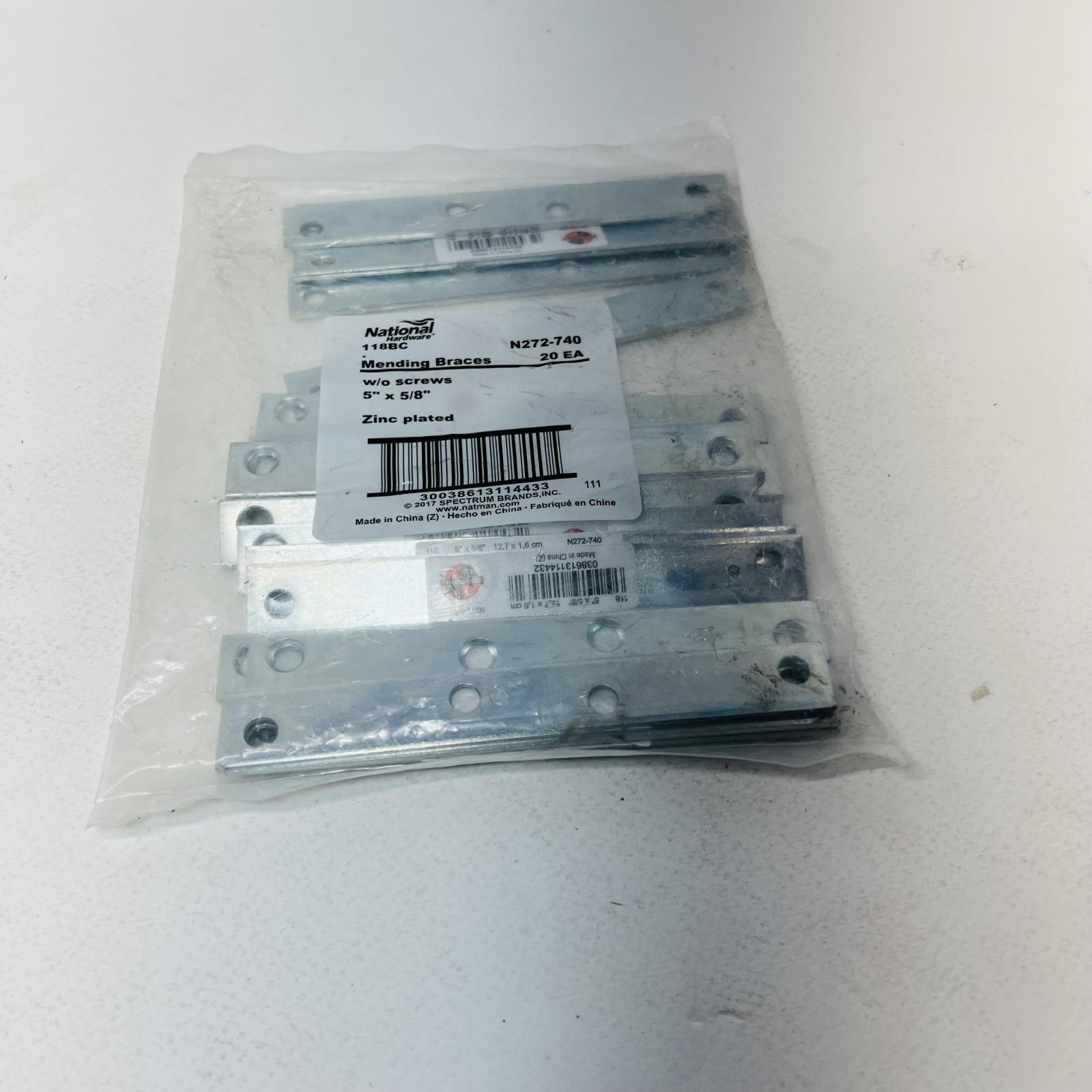 This 20-pack of National N272-740 mending plates measures 5"x5/8" and is in new condition. Ideal for various hardware applications.