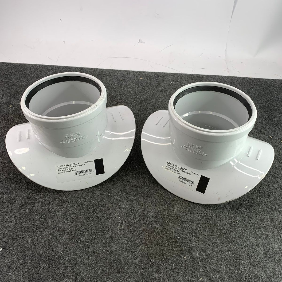 This 2-pack of GPK 136-0106CR PVC Saddle Tees is in excellent condition, though dusty from storage. Ideal for plumbing projects.