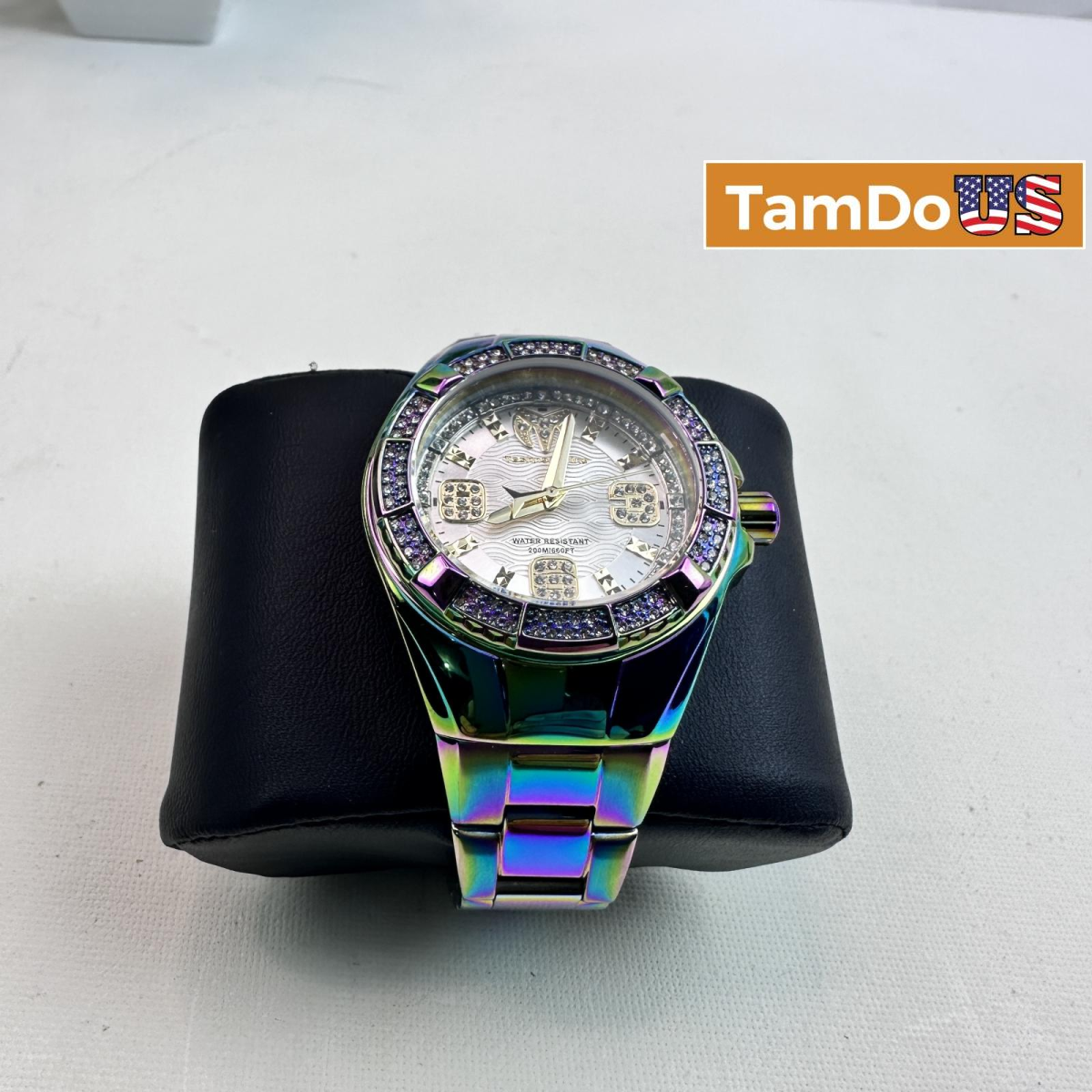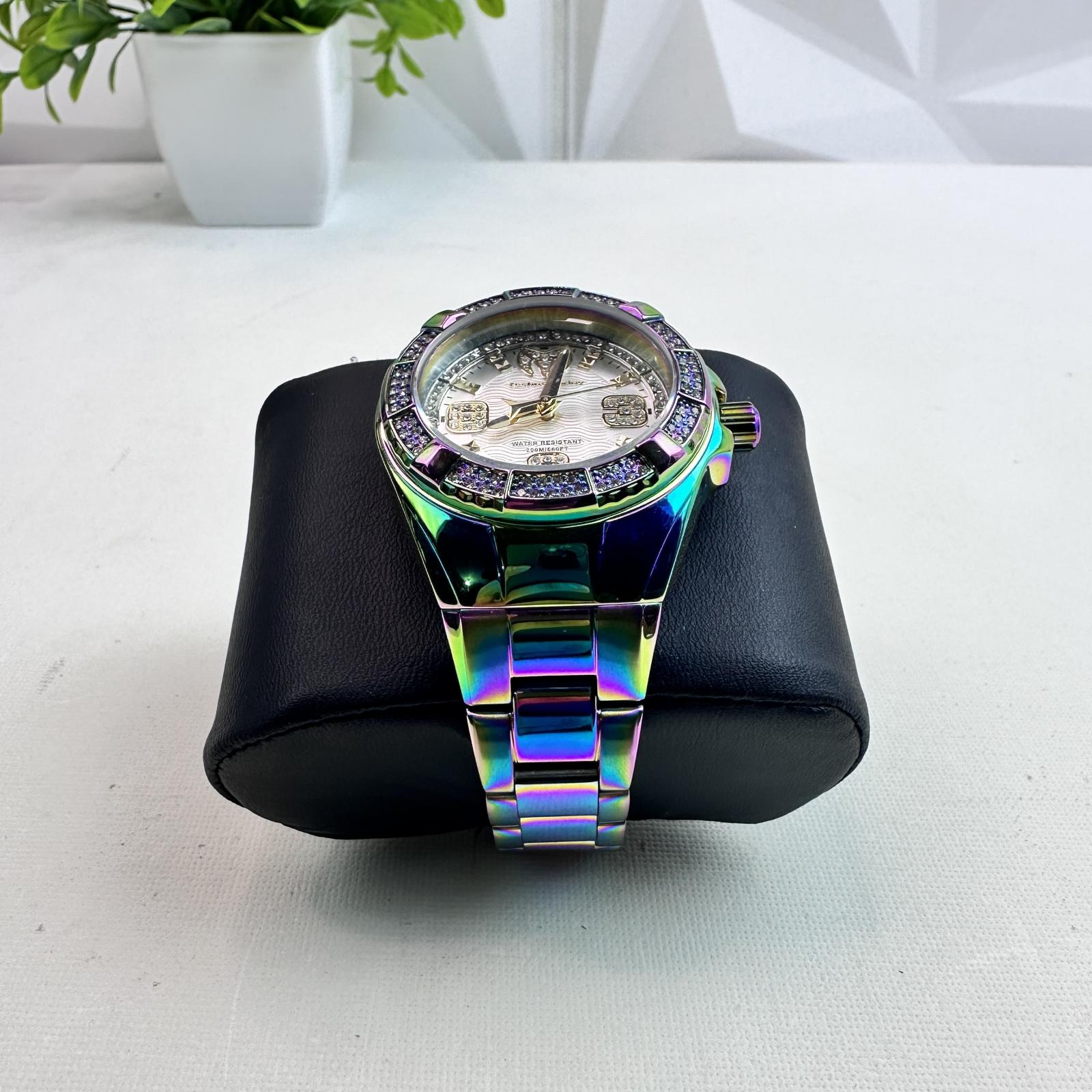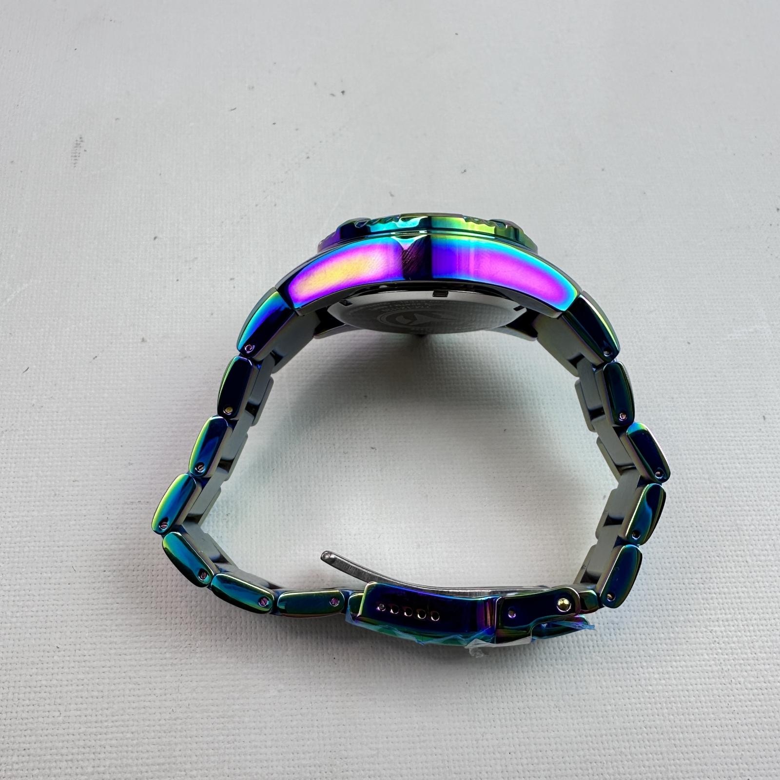 With 100 m water resistance, it’s designed for both style and performance. The iridescent dial, complemented by stainless steel band and bezel, gives it a shimmering, eye-catching appeal that transitions effortlessly between casual and dress-wear.