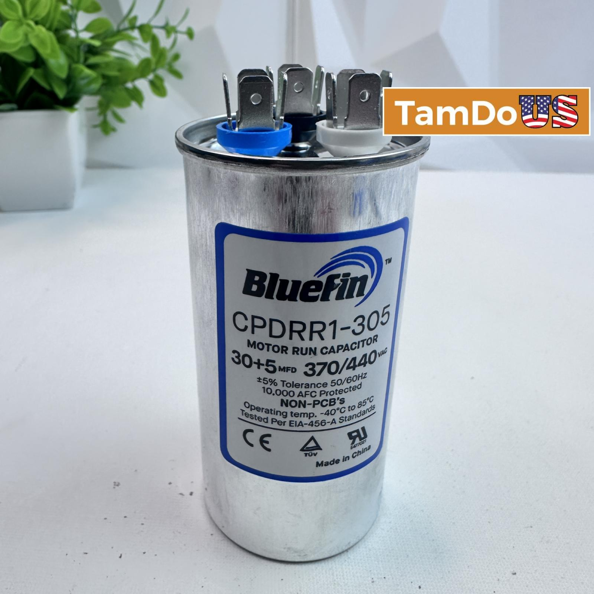 The BlueFin CPDRR1-305 is a new open box dual run motor capacitor with a capacitance of 30/5 µF and a voltage rating of 370/440V AC. Ideal for HVAC systems.