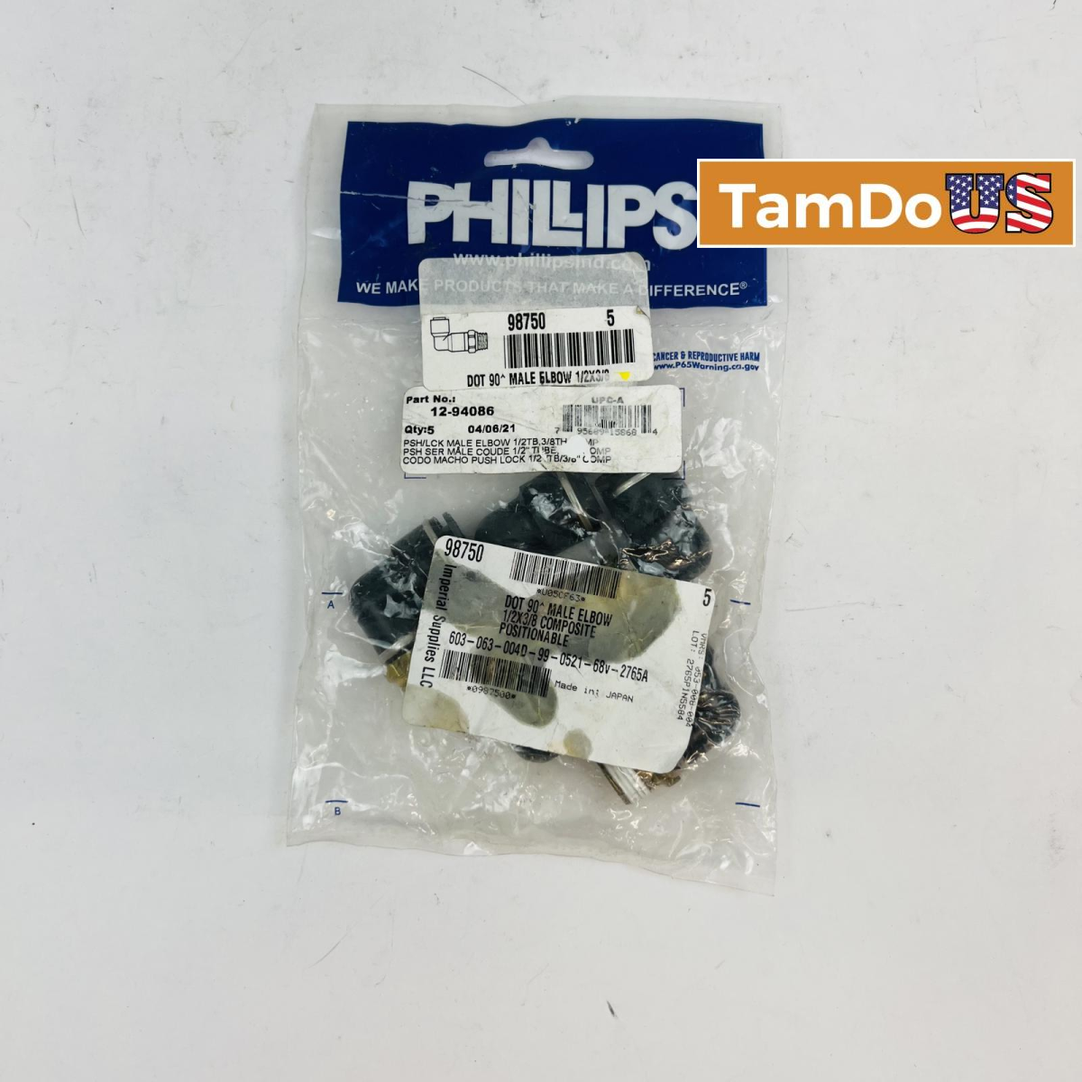 This 5-pack of Phillips 98750 DOT 90° Male Elbow fittings is new and designed for heavy-duty truck and trailer air systems. The composite push-lock design allows for quick installation without tools.