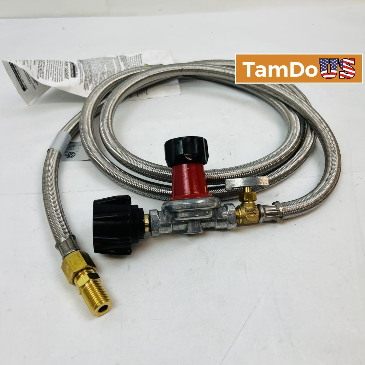 This new open box stainless steel braided propane hose kit includes a built-in regulator for safe connections. Ideal for BBQs, heaters, and fire pits.