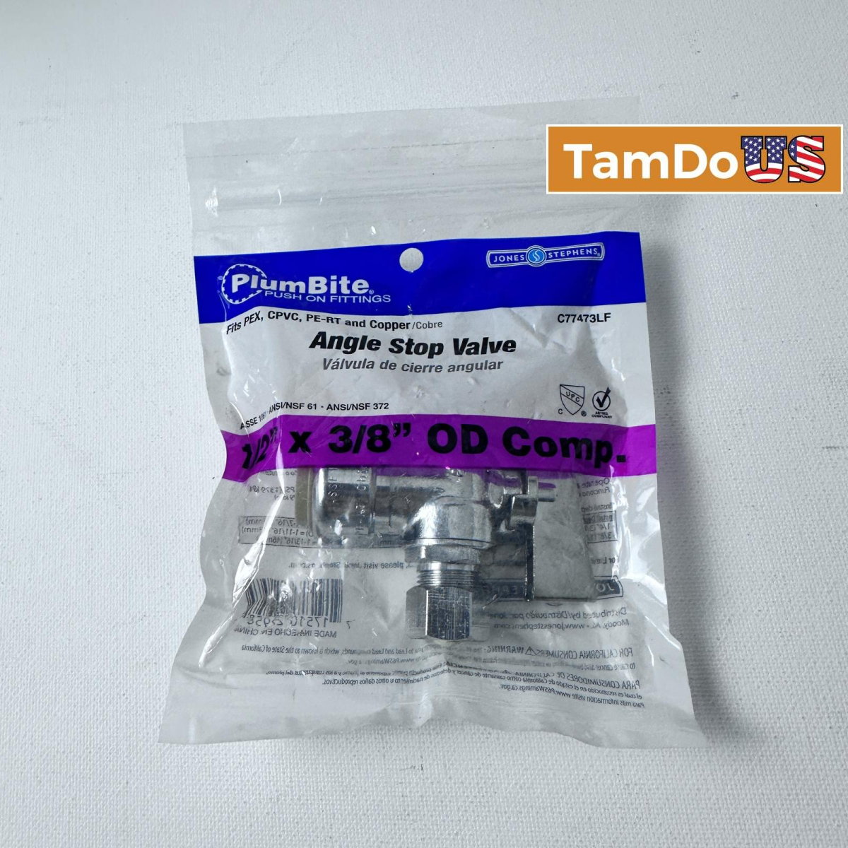 The PlumBite C77473LF Angle Stop Valve is new and lead-free, designed for easy installation. It fits various pipe types without tools, ideal for household fixtures.