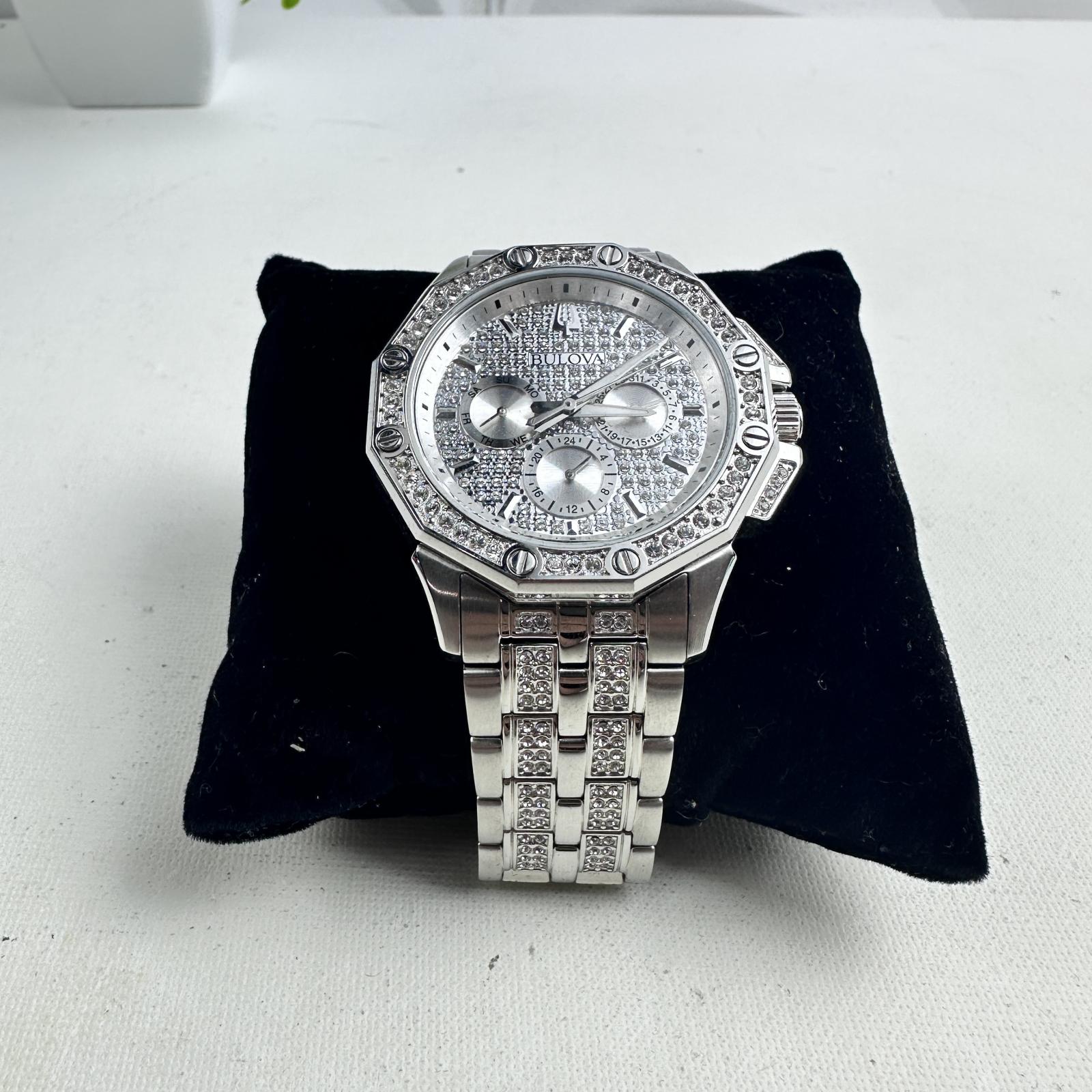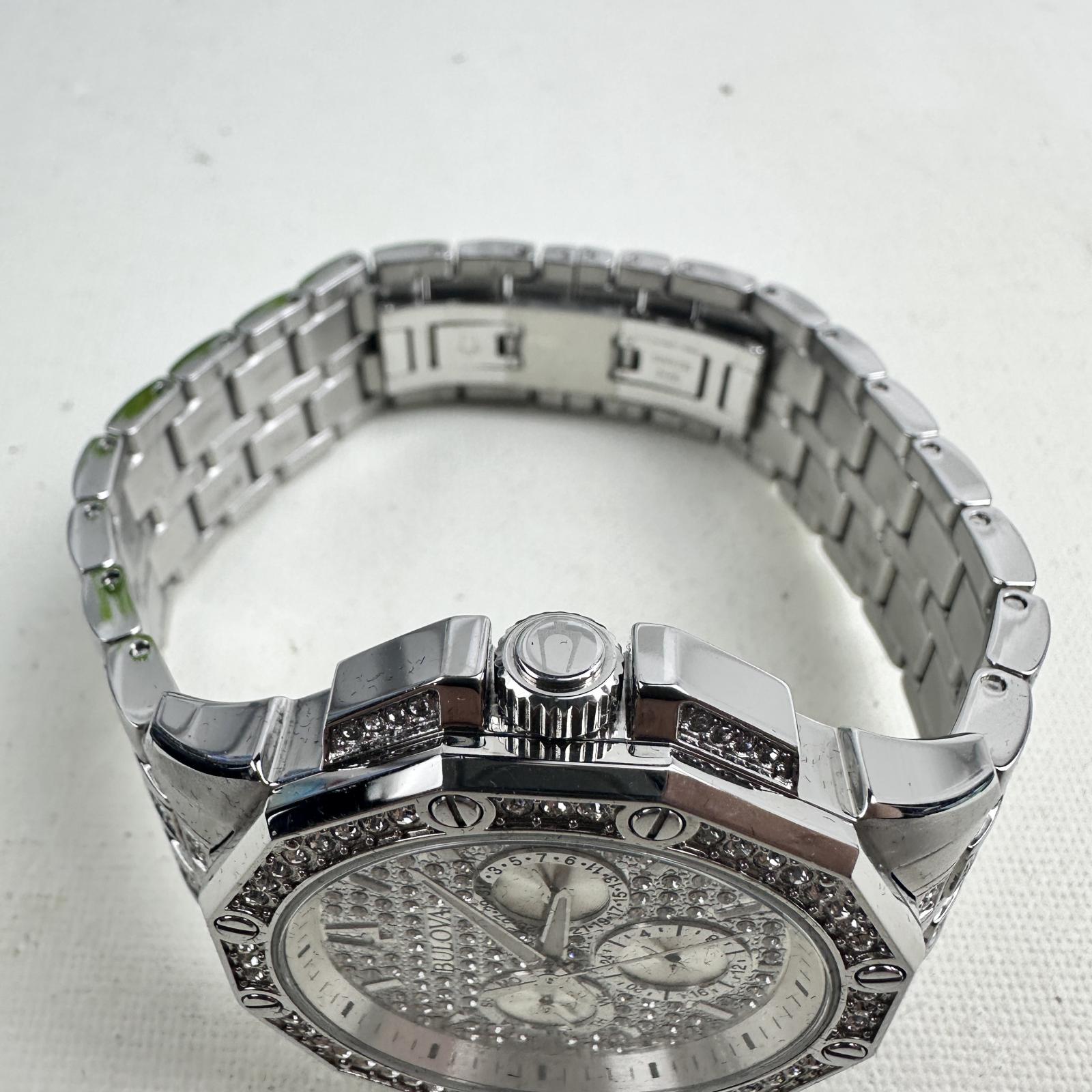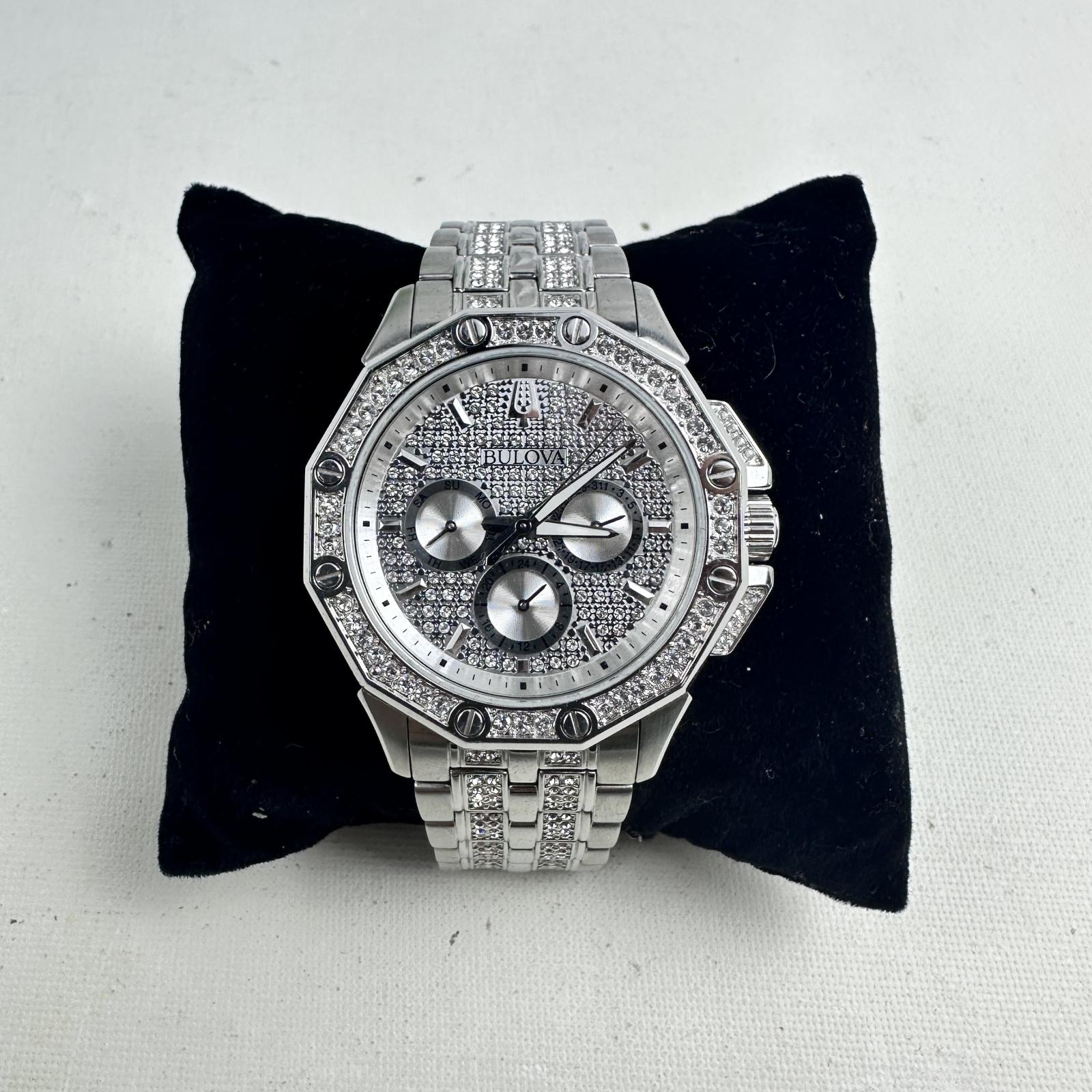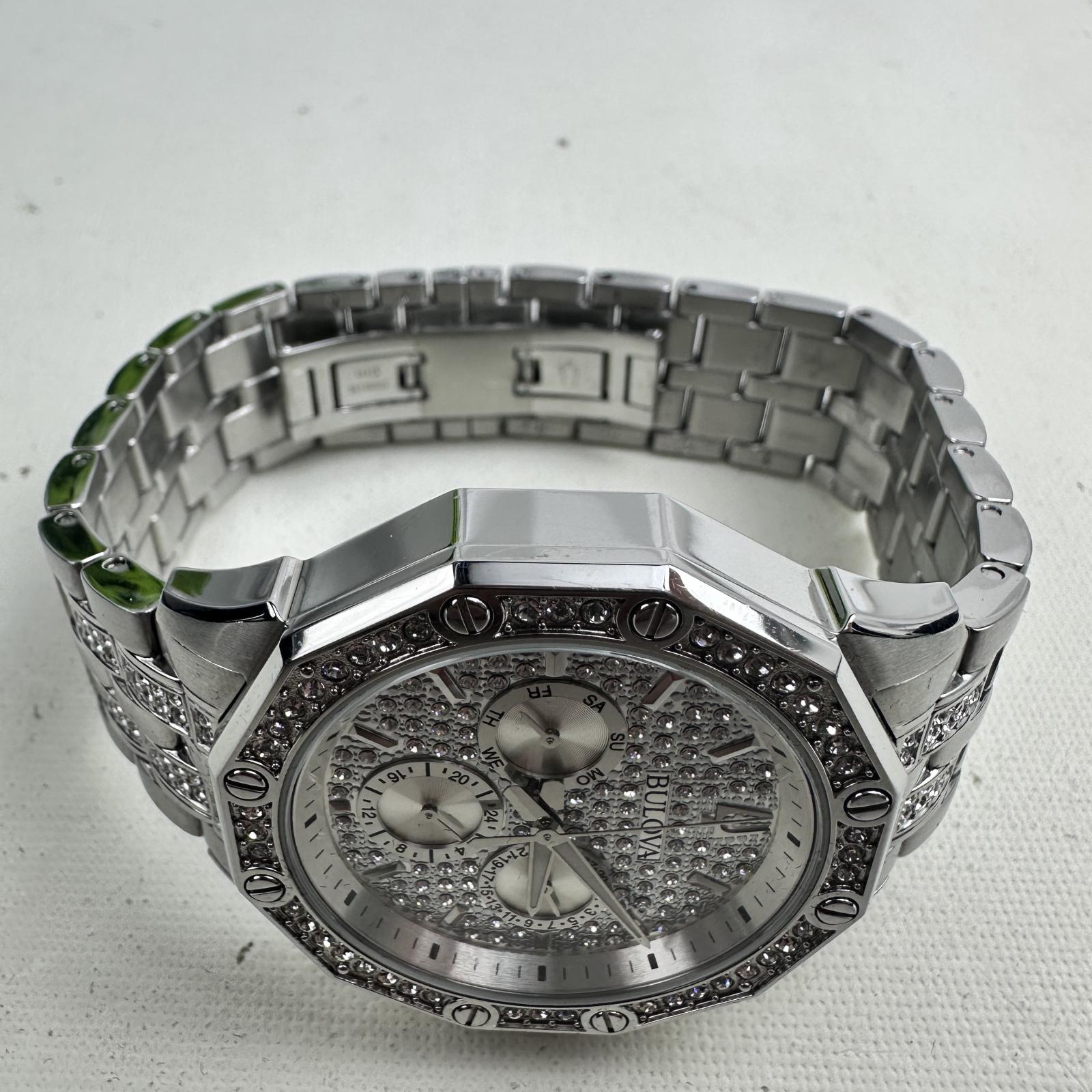 with minor signs of use. Make a bold statement with the Bulova Octava 96C134 men's watch, featuring a 42mm silver-tone stainless steel case and bracelet embellished with over 300 Swarovski crystals.