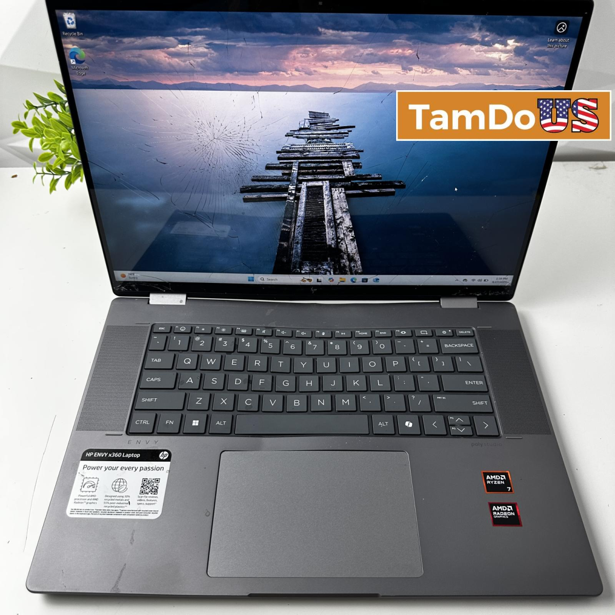 This HP Envy x360 2-in-1 laptop is for parts only. It features a 16" FHD display and is powered by a Ryzen 7 processor. The screen is broken and the case is dented.
