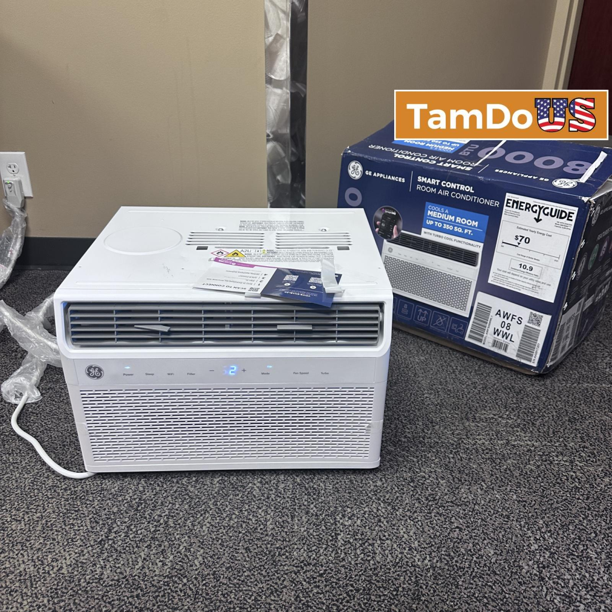 This GE 8,000 BTU Smart Window Air Conditioner is in new open box condition with a slight dent. Ideal for medium rooms up to 350 sq. ft., it features WiFi connectivity for remote control.