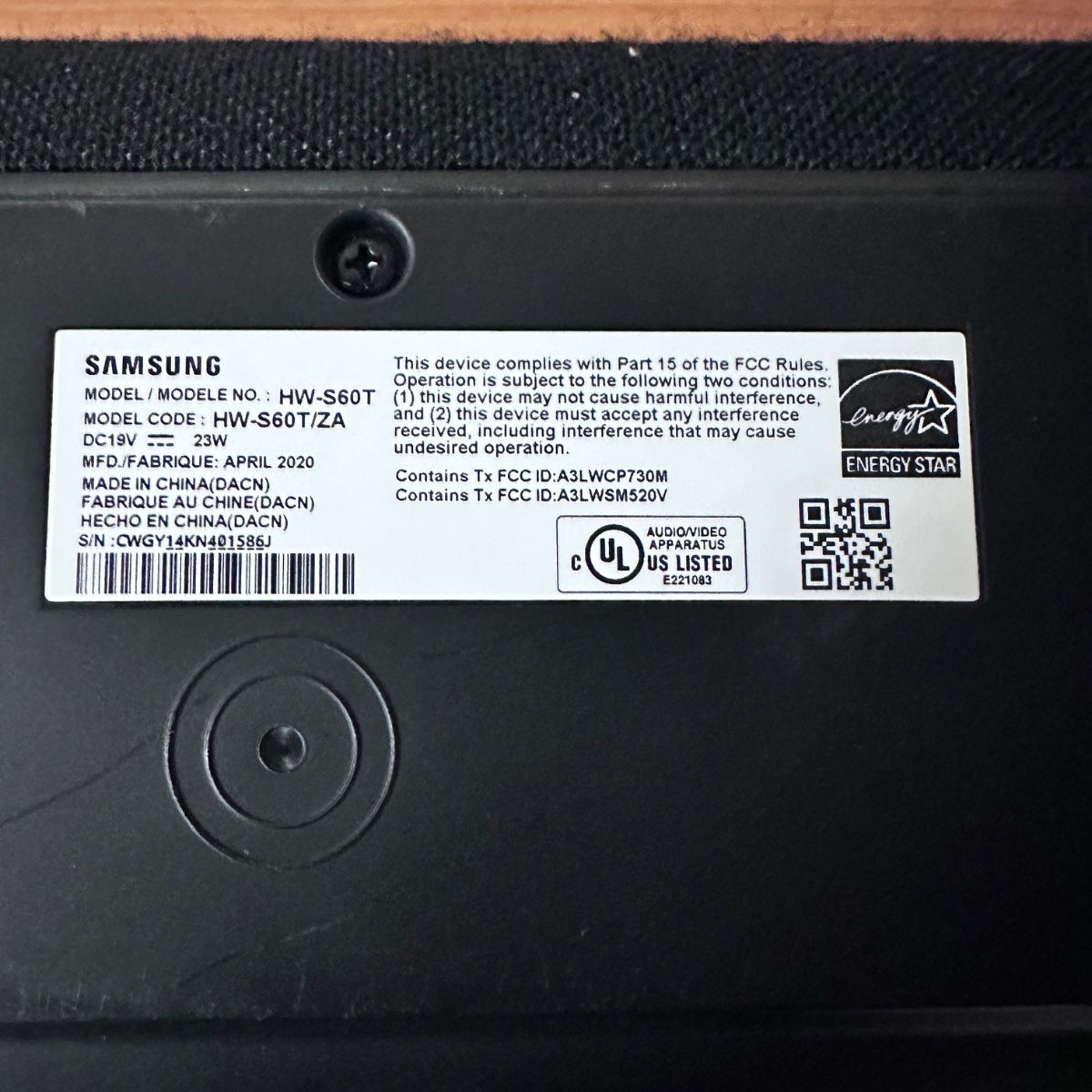 , may have signs of use/surface marks. The Samsung HW-S60T is a sleek 4.0-channel all-in-one soundbar designed to deliver clear dialogue and immersive sound without the need for a separate subwoofer.