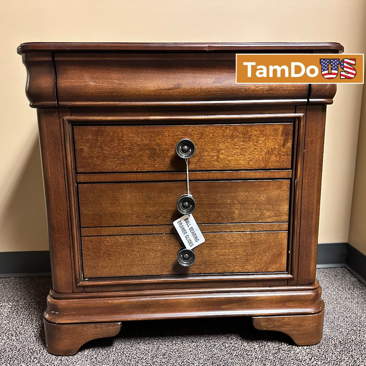 This premium solid-wood nightstand CM750NSO features a rich walnut finish and 3 smooth ball-bearing drawers. It is in new condition with minor scratches from shipping.