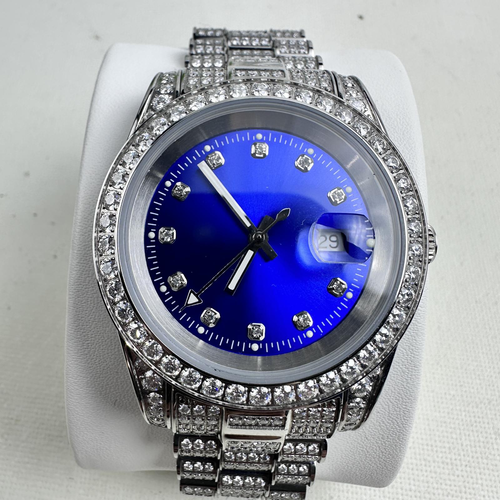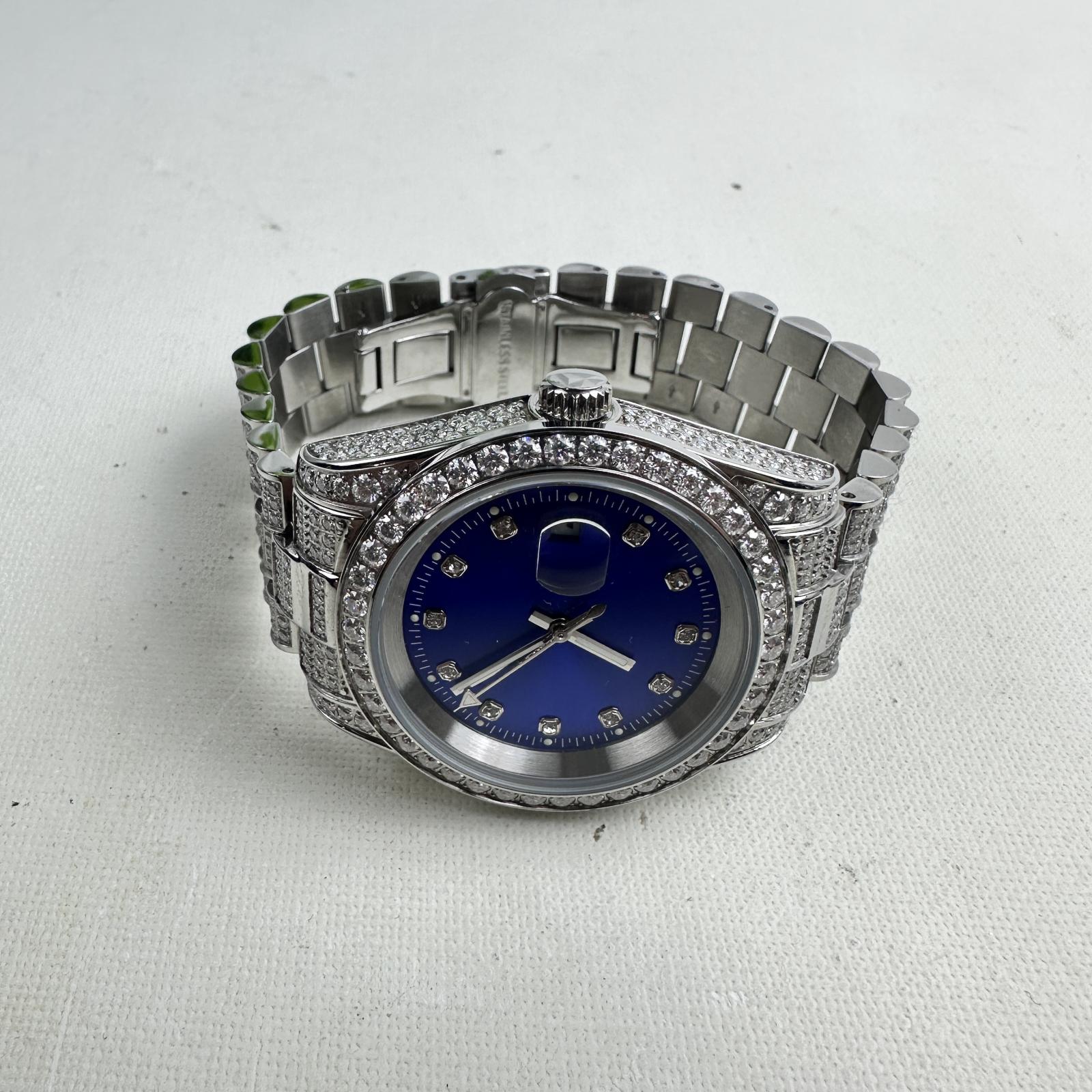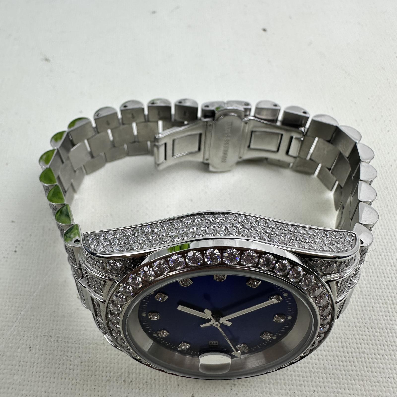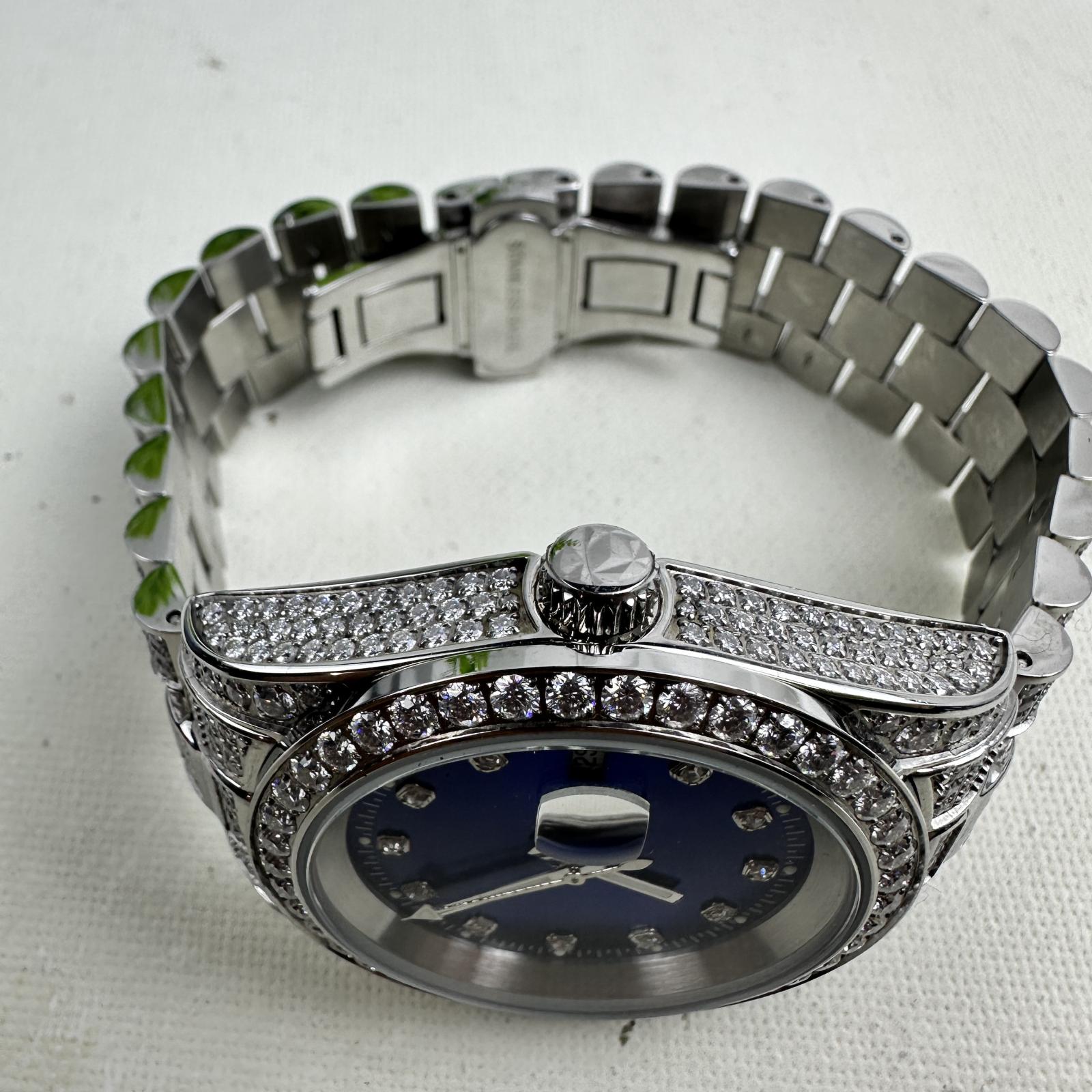 with minor signs of use. Turn heads with the Moissanite Presidential Watch featuring a bold 41mm case and stunning blue dial.