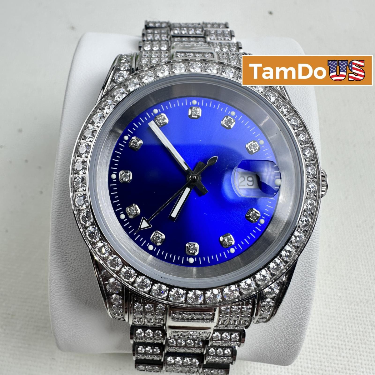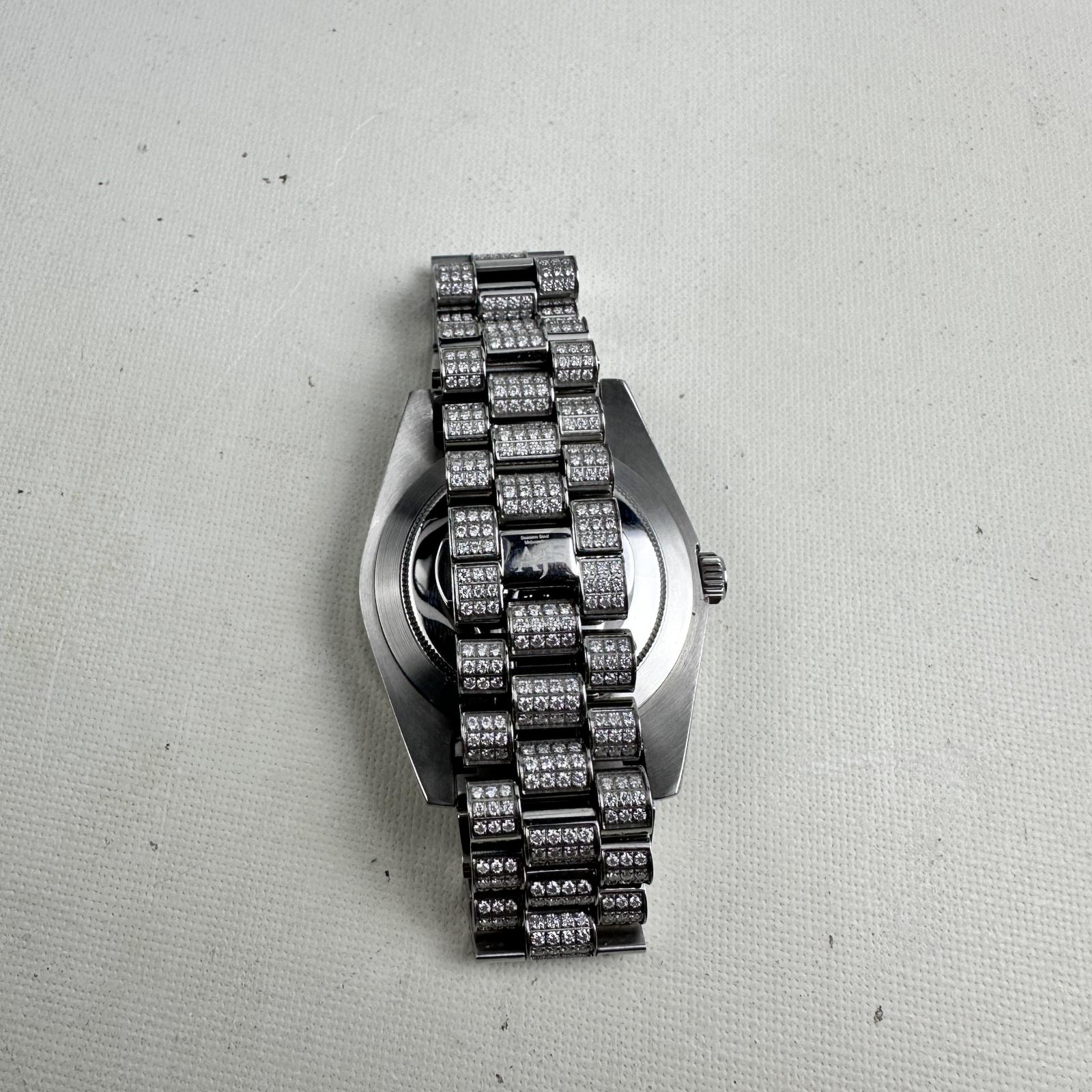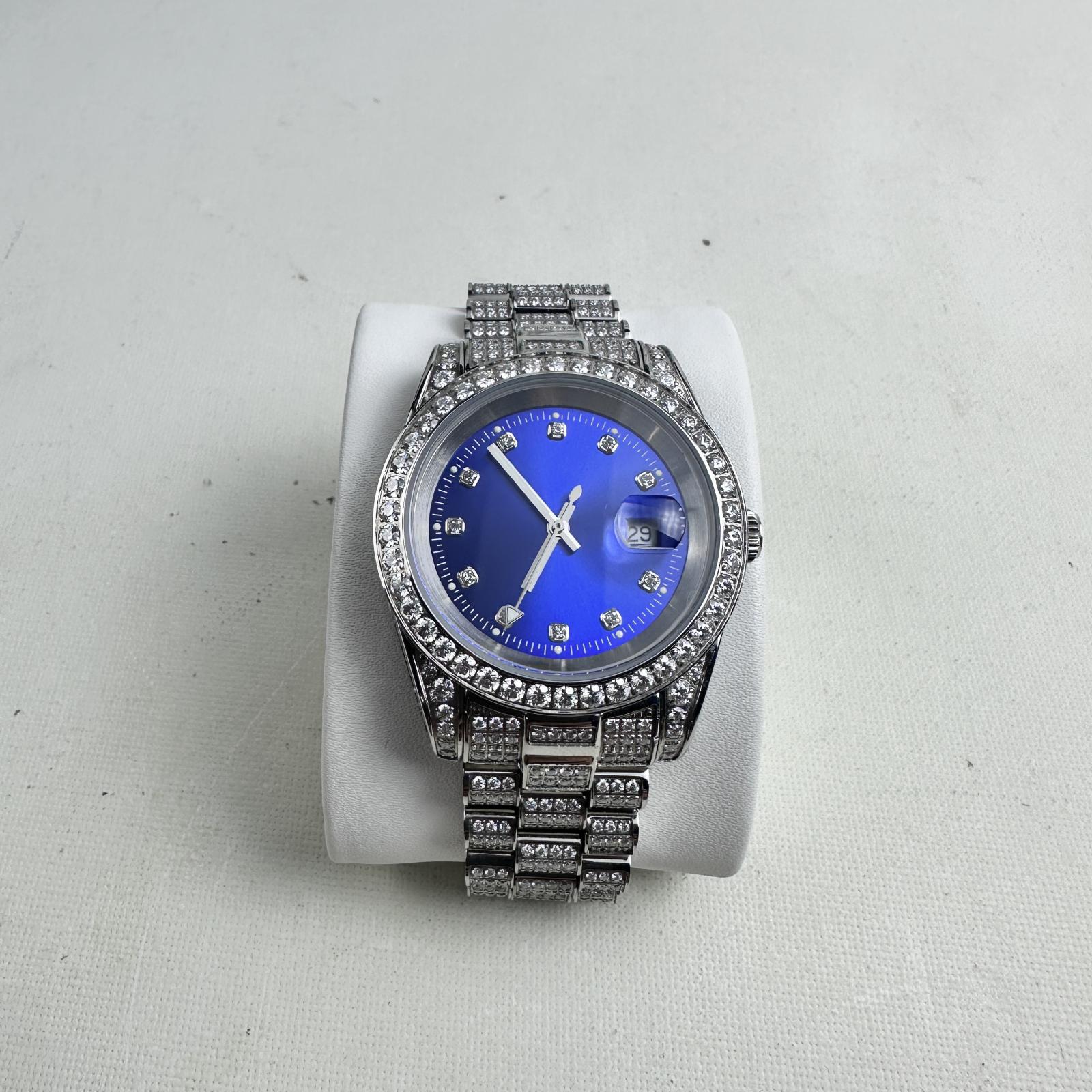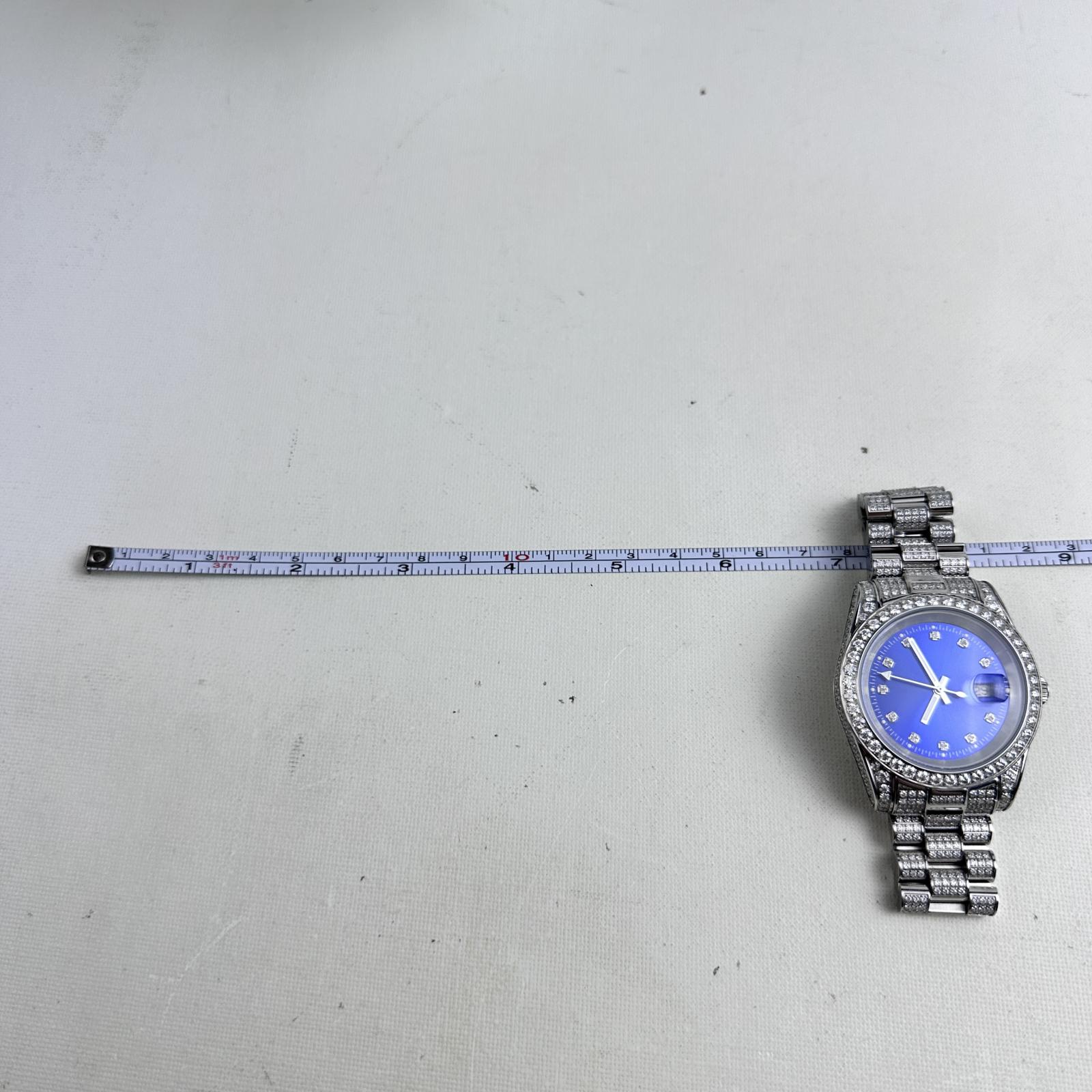 with minor signs of use. Turn heads with the Moissanite Presidential Watch featuring a bold 41mm case and stunning blue dial.