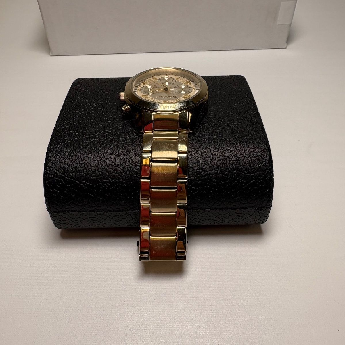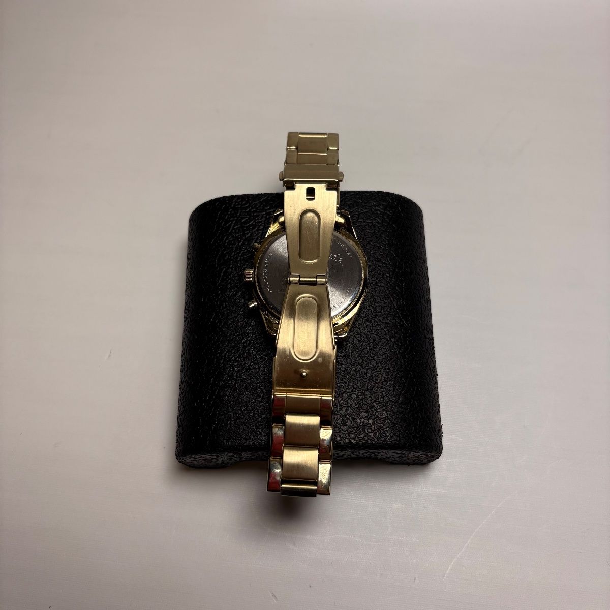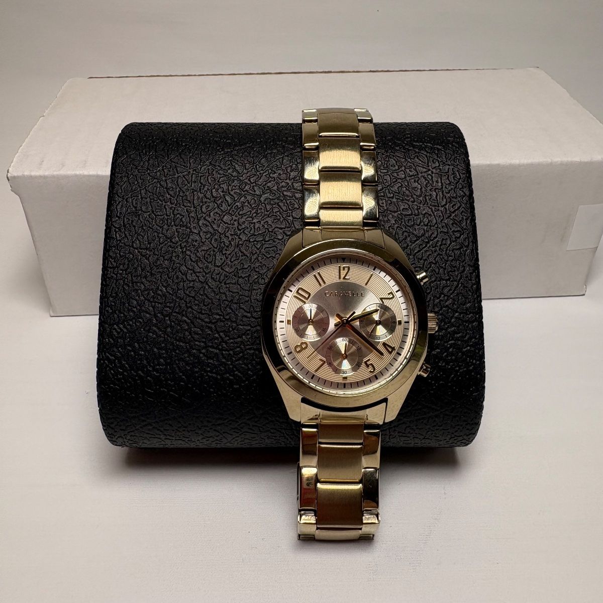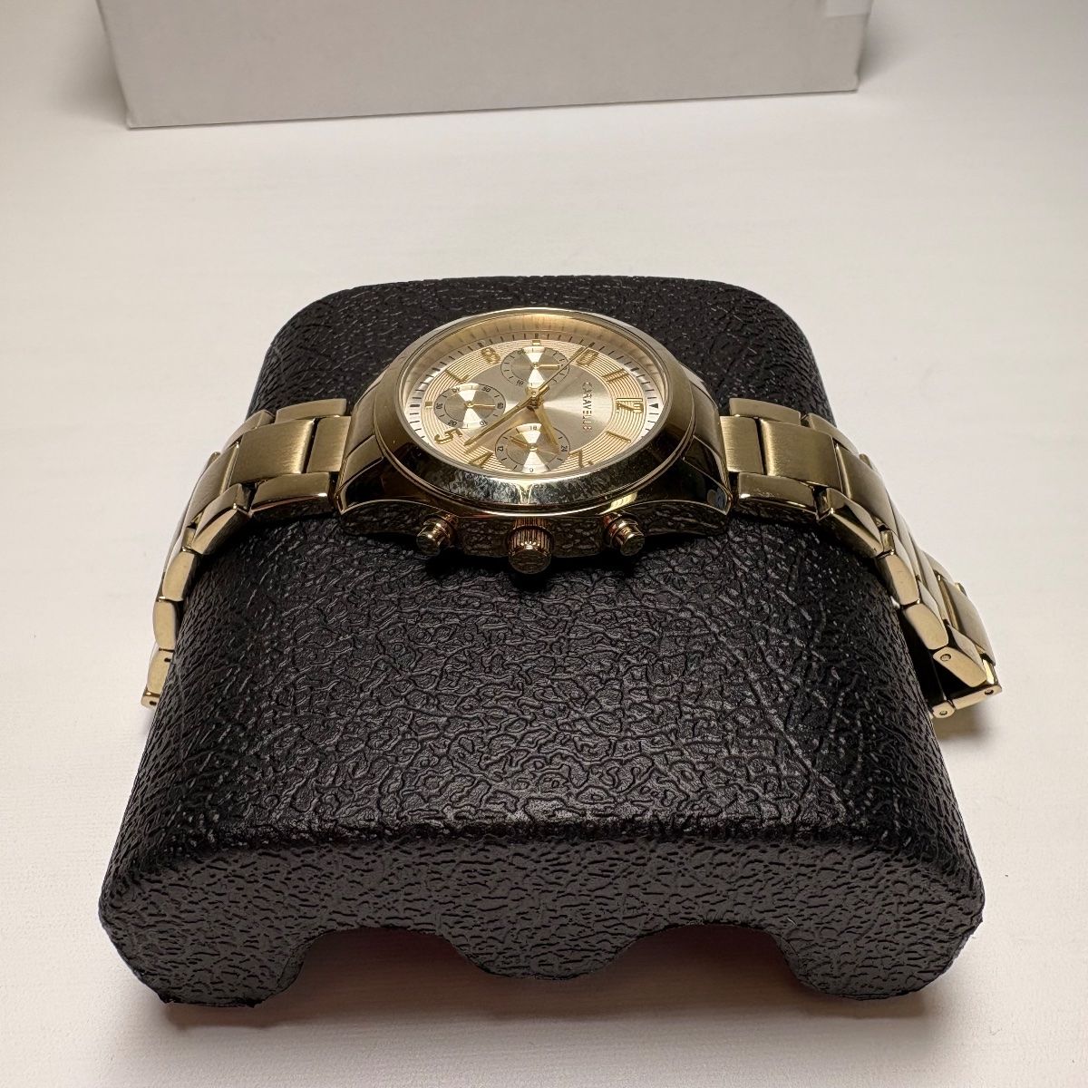 Featuring a 36mm gold-tone stainless steel case and matching bracelet, this stunning timepiece brings together elegance and precision. The watch is powered by a reliable quartz movement, ensuring accurate timekeeping, while the chronograph functionality allows you to effortlessly track elapsed time.