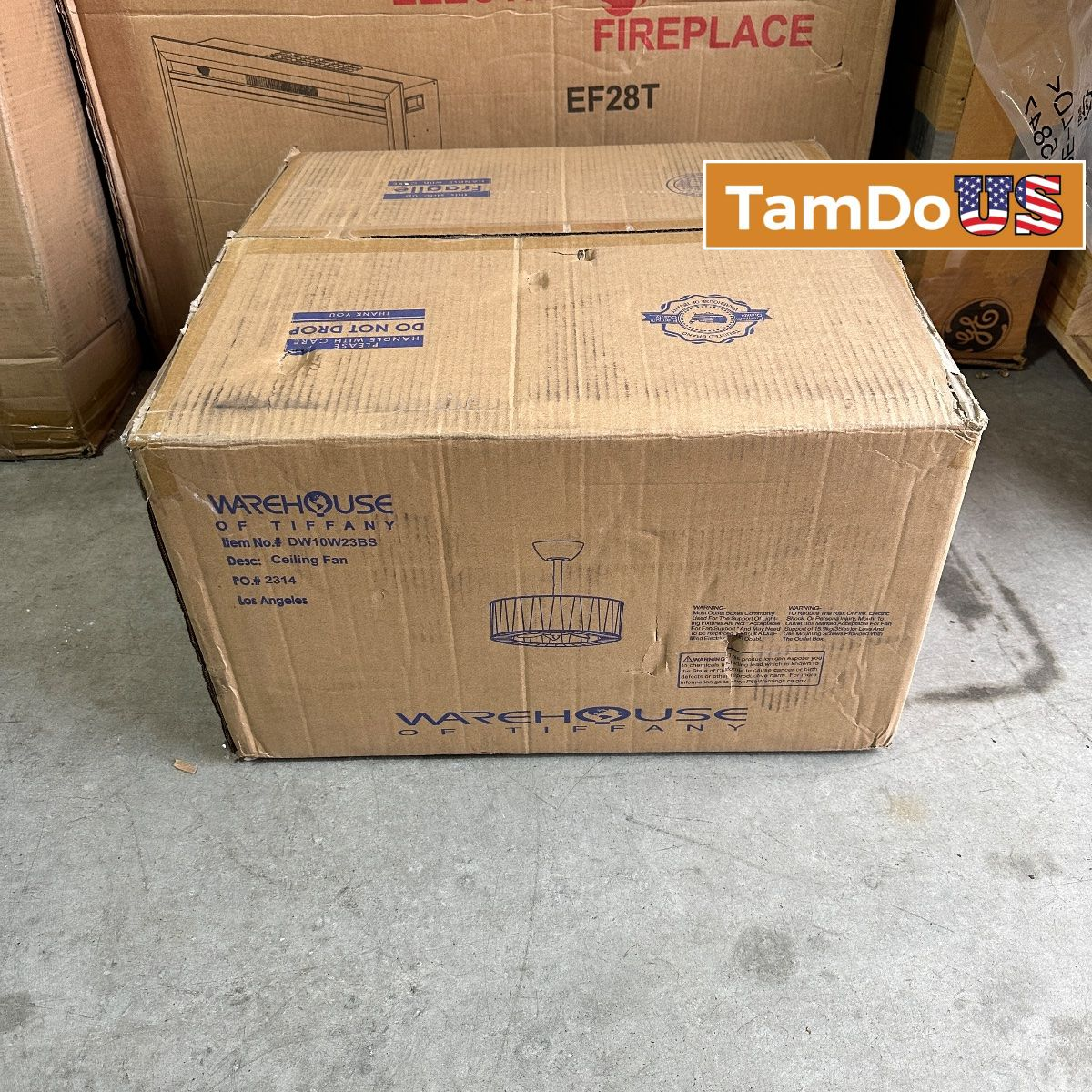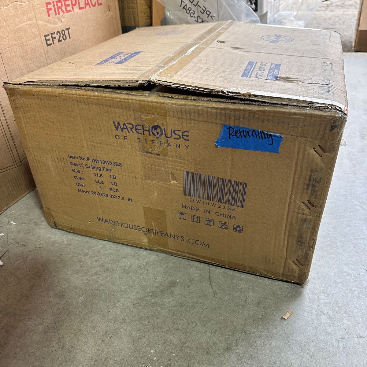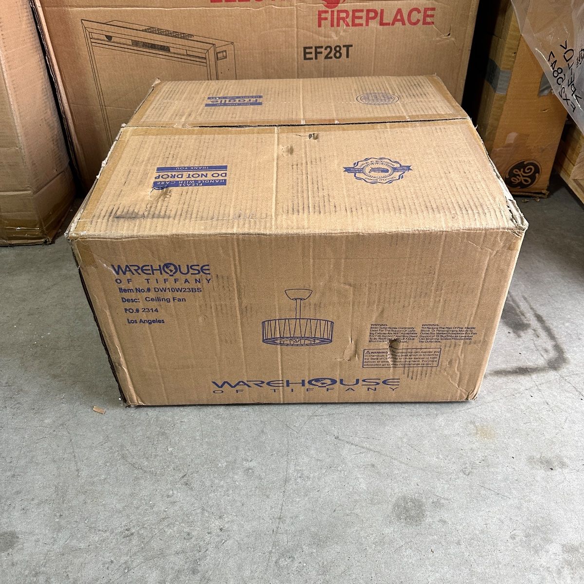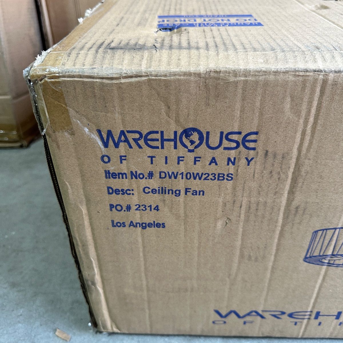 Specifications - Brand: Warehouse of Tiffany - Model / Item No.: DW10W23BS - Product Type: Ceiling Fan with Light - Style: Drum Cage / Modern Industrial - Color: Brushed Steel / Metal - Installation: Hardwired (standard ceiling mount) - Condition: New in box - Includes: Fan unit + hardware + instructions