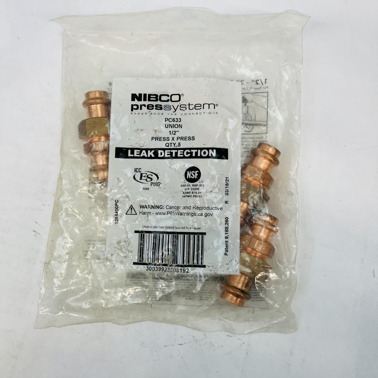 This is a 5-pack of NIBCO PC633 1/2" Copper Union Press fittings in new condition. Ideal for plumbing projects.