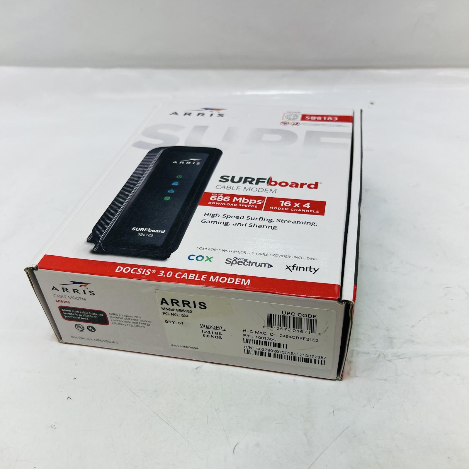 The ARRIS SB6183 is a DOCSIS 3.0 cable modem in new open box condition. It includes all original accessories and is ready for use.