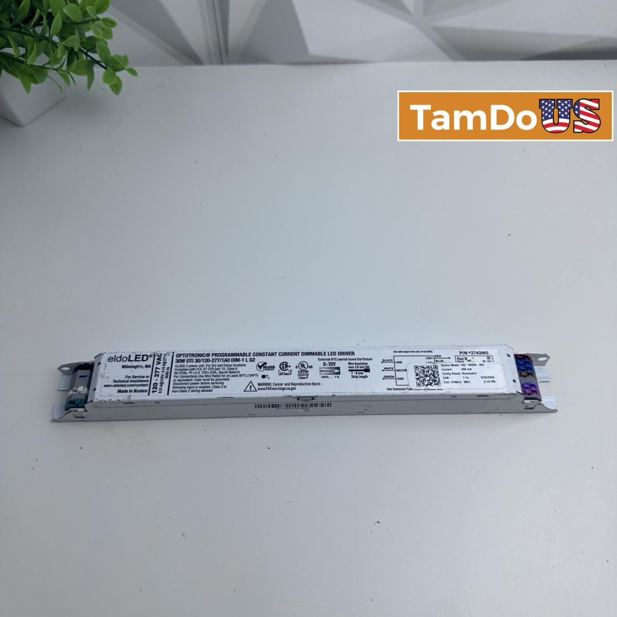 The eldoLED OPTOTRONIC 30W LED driver is in fair condition with signs of use. It supports 0-10V dimming and is suitable for various LED applications.