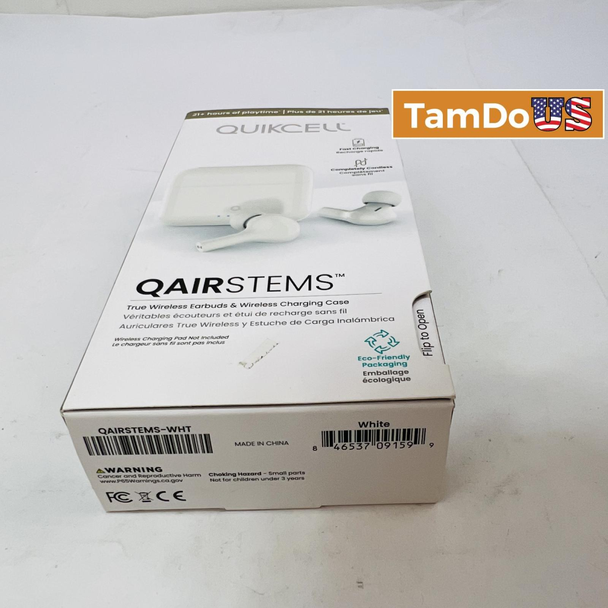 The Quikcell QAIRSTEMS True Wireless Earbuds offer a lightweight, cord-free audio experience. New condition with a charging case for over 21 hours of playtime.